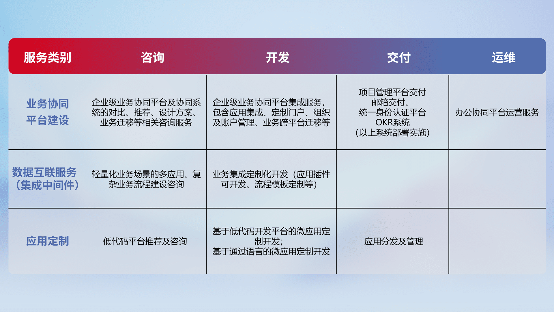 针对钉钉、、、企微、、、、IDaas等平台级产品提供产品的规划、、方案、、交付、、定制化开发等服务,,,,实现如统一协同办公、、、、智能客户服务、、、混合会议管理、、、、智能数据查询、、、等业务场景,,,实现数字化转型。。