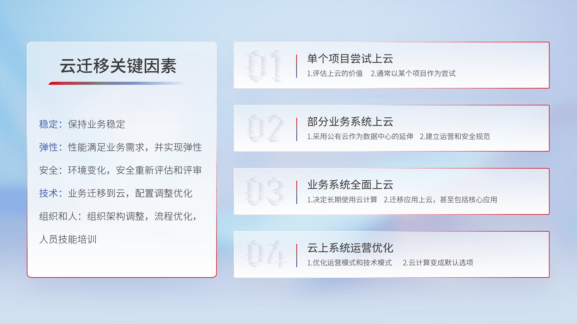 结合实际业务,,,,从规划设计、、、、云平台选型、、、云原生改造、、、数据迁移、、、、集成交付,,,迁移全过程为客户识别最佳上云路径,,,做好风险识别管理,,,设计网络架构、、、身份权限、、安全审计合规、、、、操作审计、、日志审计、、、监控告警策略、、、、多站点容灾设计等,,,对云上基础设施进行整体规划,,,,提升IT治理水平,,,,以满足弹性、、、高可用、、、高性能的需求。。。。