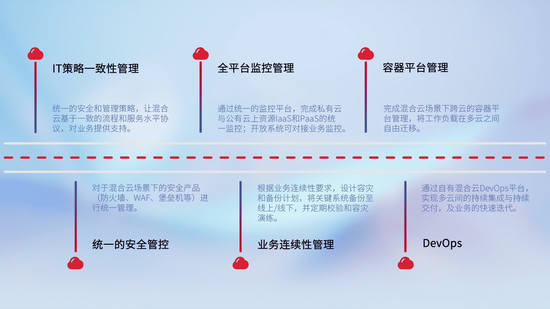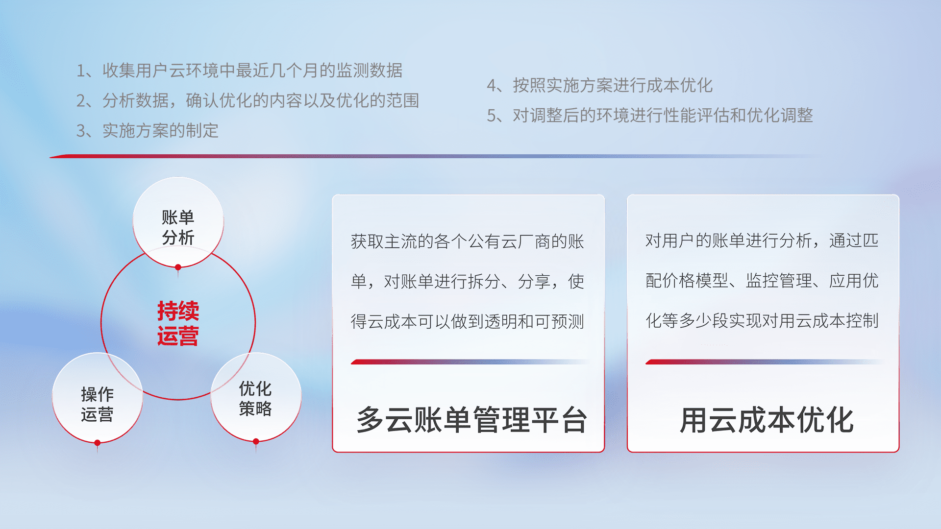 通过多云纳管,,以统一的资源数据模型把客户的云资源进行抽象和封装,,进而实现对多云资源的统一操作,,,保障云资源管理的可靠性、、、、稳定性与可用性。。。。量身定制化运维内容,,,配置、、、、开发运维、、补丁管理、、、、备份、、监控、、认证和访问管理、、审计和日常巡检等,,,,保障在用云过程中的可靠度,,,稳定度以及高可用率。。。